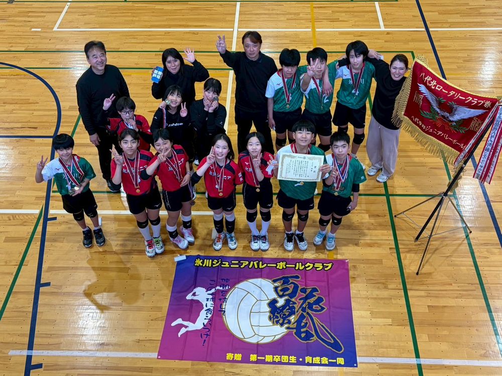 | コロナが5類に移行し、大会も以前のように実施できるようになったこの年は、八代ジュニア男子が、4つの県大会を全て制覇し、久しぶりに全国大会出場を決めた年であった。女子は、長嶺JVCが 全国大会を決めて、2月に実施された山本隆弘主催の「t-five小学生バレーボール大会で優勝した年でもある。この年の北ロータリー大会の決勝は、その八代ジュニア男子と八代金剛ジュニアが戦った。第2セットは、デュースにまでもつれる展開となったが、ジュニア男子が逃げ切り、優勝した。この年は、男子の部員が各チーム増えて、混合チームとして戦うチームが目立つ年になった。 |